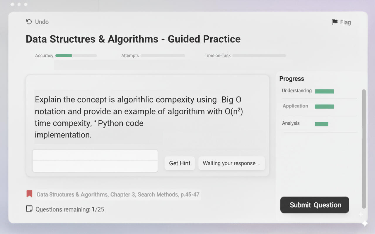 Your coach adjusts difficulty, hints, and follow-ups based on what you’ve already mastered and where you’re stuck—so every session targets your next gain. Progress badges show Ready vs Needs work at a glance.
