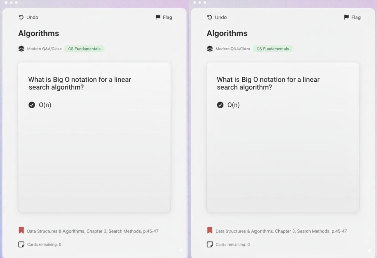 Your flashcards reword themselves each session — so you learn concepts, not just phrasing. You can export decks to Anki anytime.